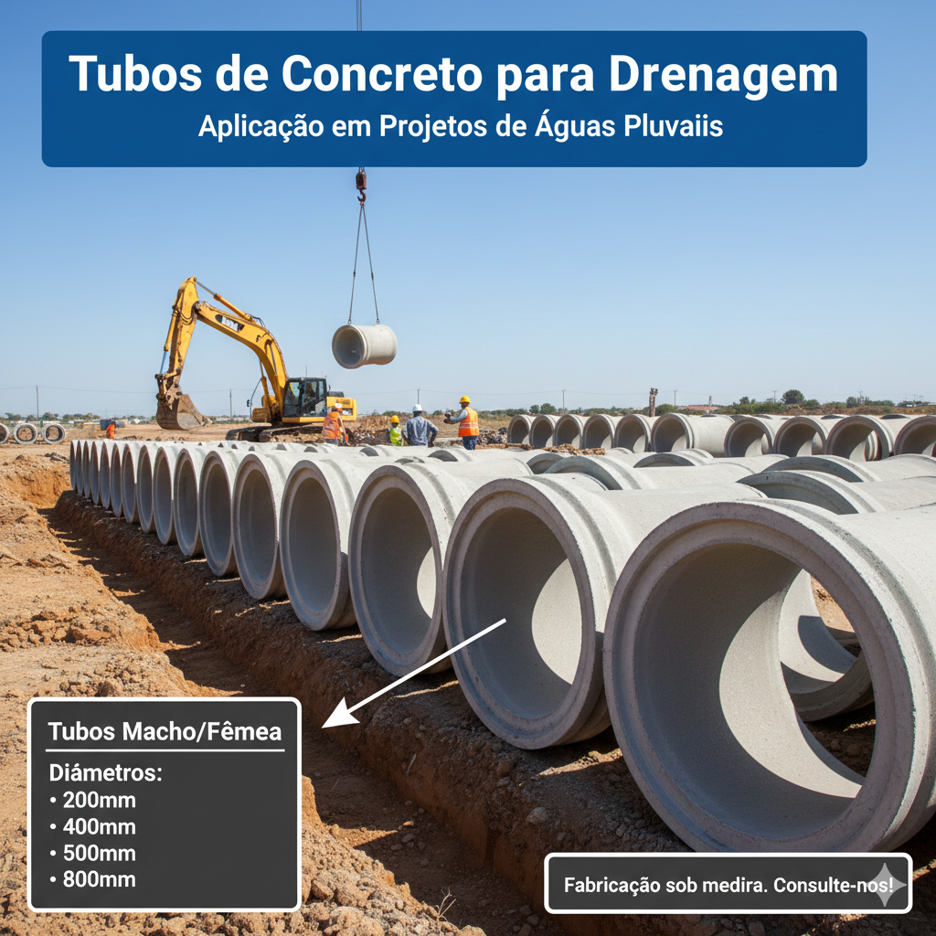 Nossos tubos circulares de concreto, são para aplicações em projetos de drenagem de águas pluviais. Oferecemos a opção de encaixe macho-fêmea, com procedimentos padronizados e com constante controle de qualidade. Estas peças são dimensionadas de acordo com a sua necessidade de vazão, especificidade (condução de água pluvial ou esgoto/ efluentes) e resistência mecânica necessária (de acordo com a carga que atuará sobre a peça).